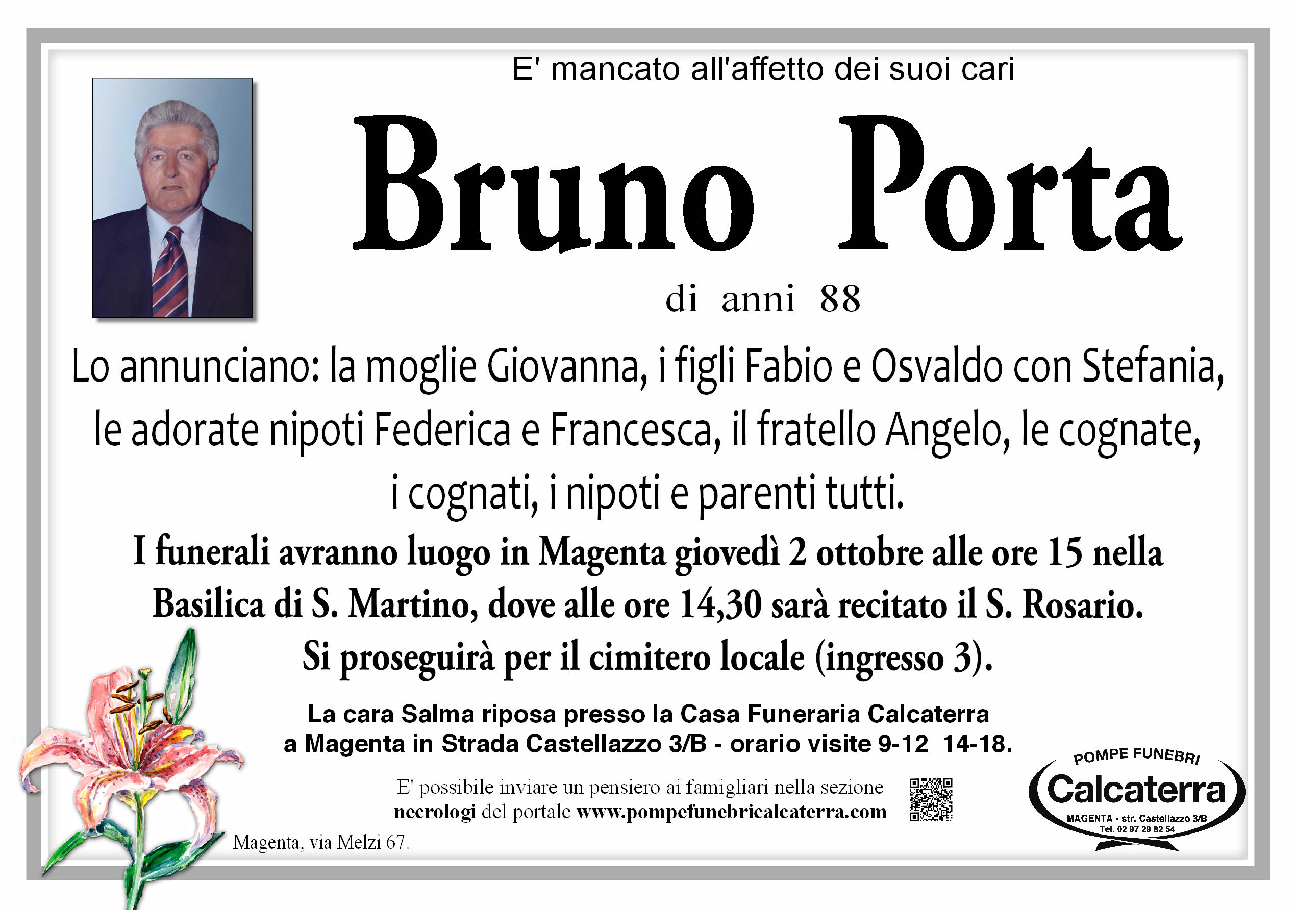 L’attività delle Pompe Funebri Calcaterra viene svolta in tutto il Magentino, Abbiatense e Novarese con passione, tradizione e serietà dal titolare Paolo e dai suoi due figli, Andrea e Davide, facendo affidamento su un’esperienza pluriennale e sulla loro capacità di prestare la migliore assistenza in caso di lutto. La professionalità acquisita negli anni di lavoro garantisce ai clienti un servizio di assoluta qualità e affidabilità.