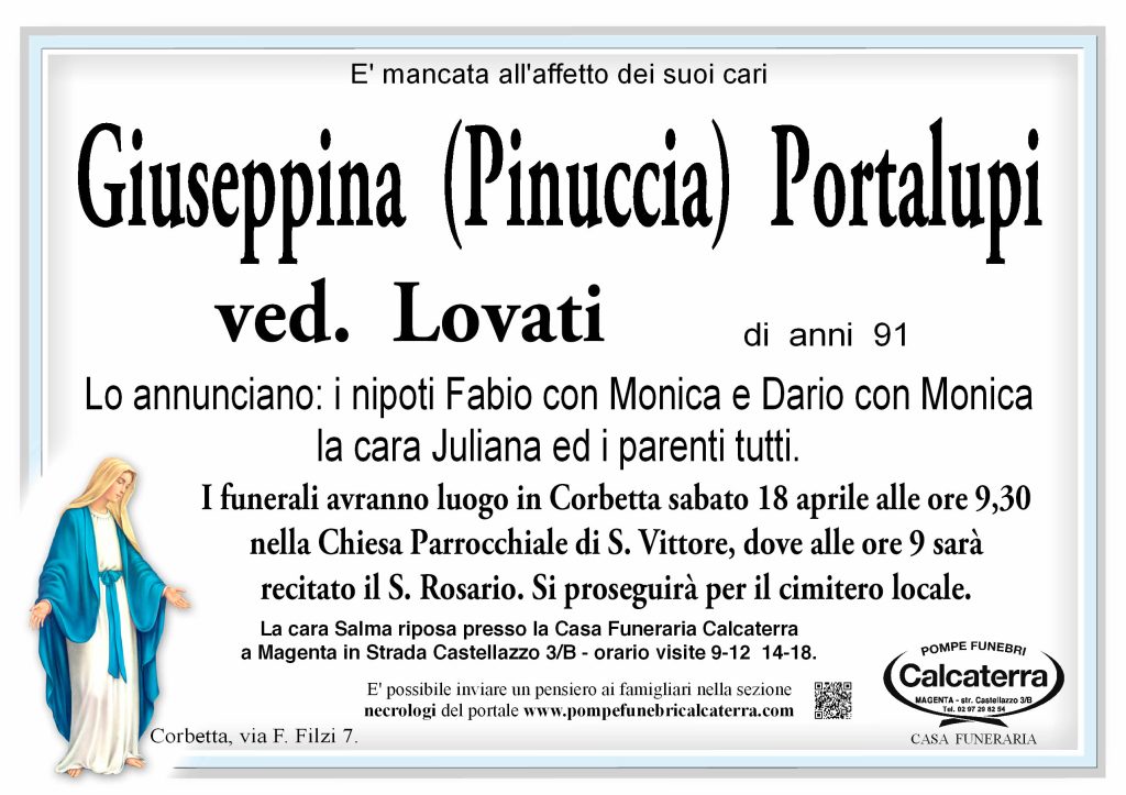 • Angelo Nicosia: Cara Sciura Portalupi ( come la chiamavo sempre )….e stato un piacere averla conosciuta. Mi mancheranno tantissimo le nostre chiacchierate, ogni occasione era buona per scambiarci pareri e idee. Avrei voluto salutarla un’ultima volta ma………pensare che finalmente si e ricongiunta con il suo amato marito, mi rincuora . Buon viaggio Sciura Pinuccia🥀