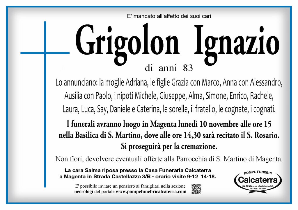 • Fondazione Fornaroli Giacobbe ETS: La presidente e il CdA della Fondazione Fornaroli Giacobbe ETS, già Scuole Materne di Magenta, si uniscono al cordoglio per la scomparsa di Ignazio Grigolon, che prese a cuore questo Ente assumendo la responsabilità di presidente dal 1976 al 1982; affidano Ignazio alla misericordia del Padre e all’intercessione di Maria Ausiliatrice, a cui era devoto; assicurano la preghiera e la vicinanza alla moglie, alle figlie e ai nipoti.