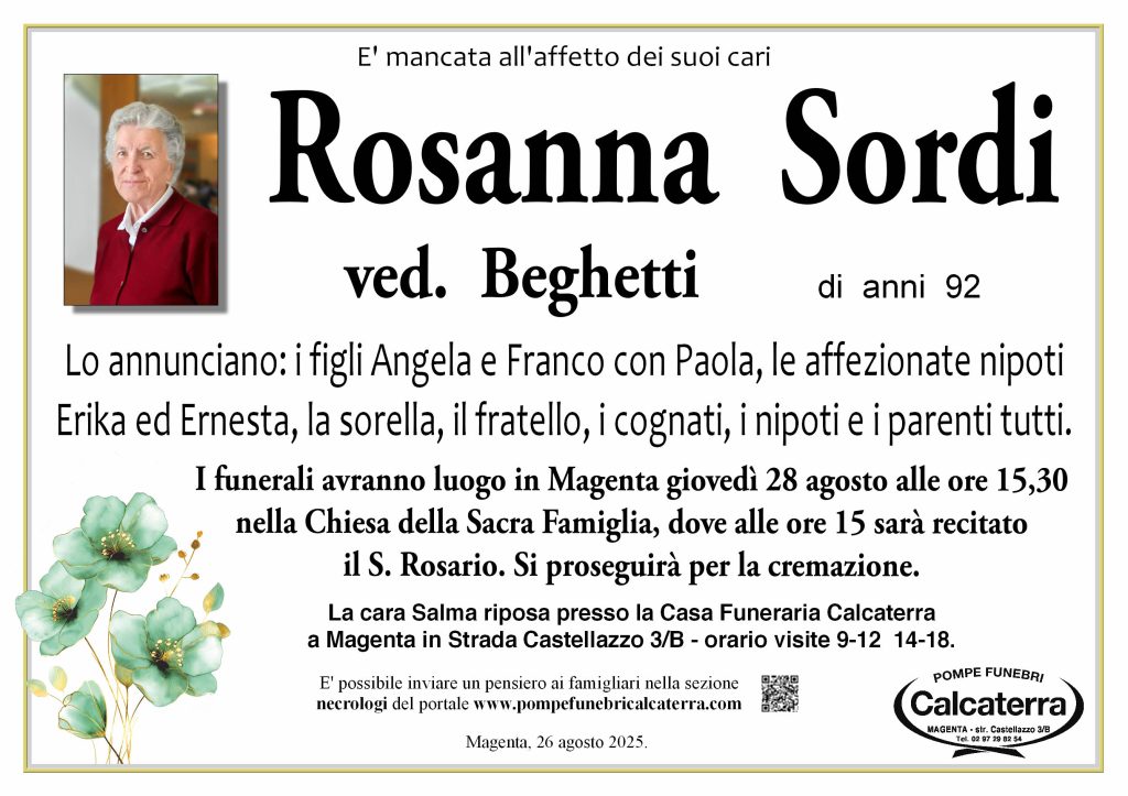 - Alessandra Sordi: Cara Zia, con te oggi se ne va un pezzo del mio cuore. Resteranno per sempre la tua dolcezza, la tua bontà e il tuo sorriso, insieme ai ricordi dei tanti momenti felici condivisi. Riposa in pace e proteggi da lassù i tuoi cari. Con infinito affetto.