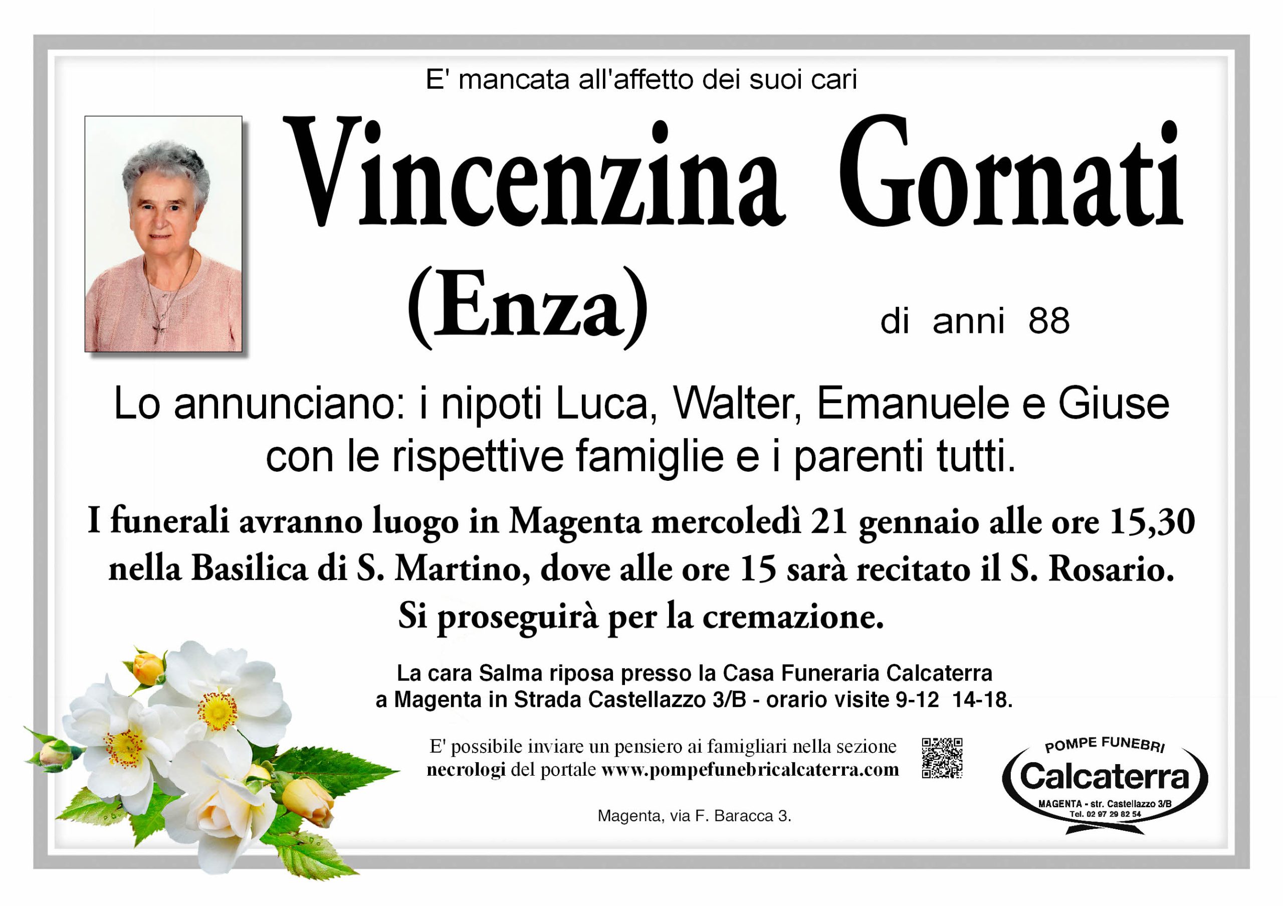 - Don Marcello Fassi: Appresa la notizia e dispiaciuto di non poter essere presente per concelebrare al suo funerale, prego per la cara “Suor Enza” e la ricordo nella Santa Messa e porgo sentite condoglianze ai famigliari. Una donna energica che ha fatto tanto del bene soprattutto per gli ammalati e ha sempre mantenuto una fede viva e vigilante. Nella mia comunità di origine a Marcallo per tanti anni ha compiuto un servizio prezioso di consolazione e vicinanza agli anziani, sofferenti e soli. Portava Gesù Eucarestia a tutti… era attenta alle persone e alla loro vita!